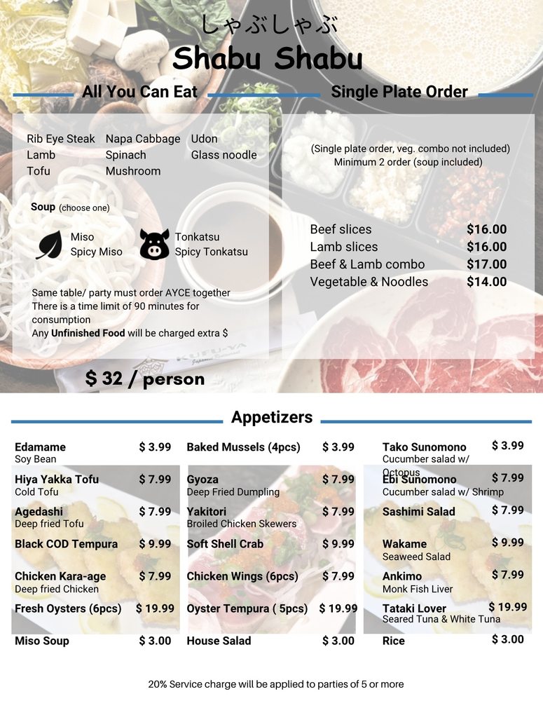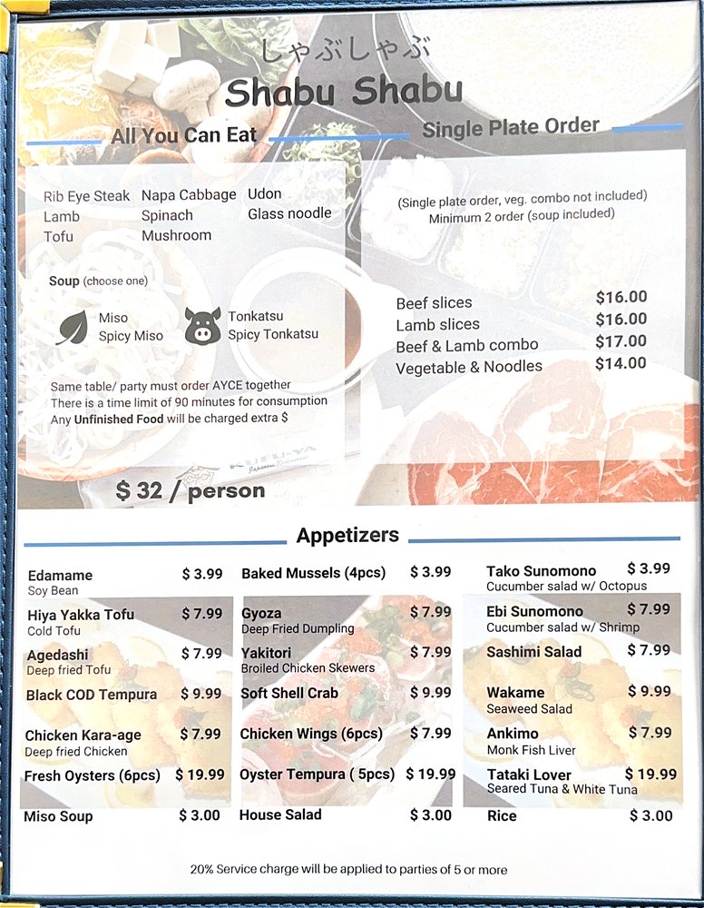 Introducing the menu at Kufuya Japanese Restaurant, located in San Francisco, where customers can enjoy a variety of options such as All-You-Can-Eat Shabu Shabu with choices of miso or tonkotsu soup, unlimited Rib Eye Steak, Lamb, Udon, Glass noodle, Tofu, Napa cabbage, Spinach, and Mushroom. Customers praise the quality of the meat and veggies, with outstanding service that keeps refilling and asking for more. While some reviewers wish for more variety, the flavorful broths and addicting sauces stand out. The chill vibes, fresh and juicy beef and lamb, and strong flavor game make Kufuya a hit for celebrations or casual gatherings. With casual dress code, good for groups, and offering Wi-Fi and outdoor seating, Kufuya Japanese Restaurant provides a unique dining experience with exceptional service and delicious hot pot options.